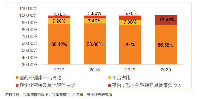 平台业务则是自营业务的补充,京东健康从通过平台销售的第三方商家赚取佣金、平台使用费和广告服务费。