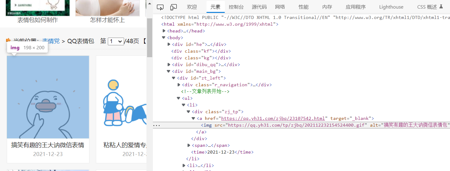 然后我们要找到我们要爬取的图片在网页代码里的位置,f12查看源代码,找到表情包如下: