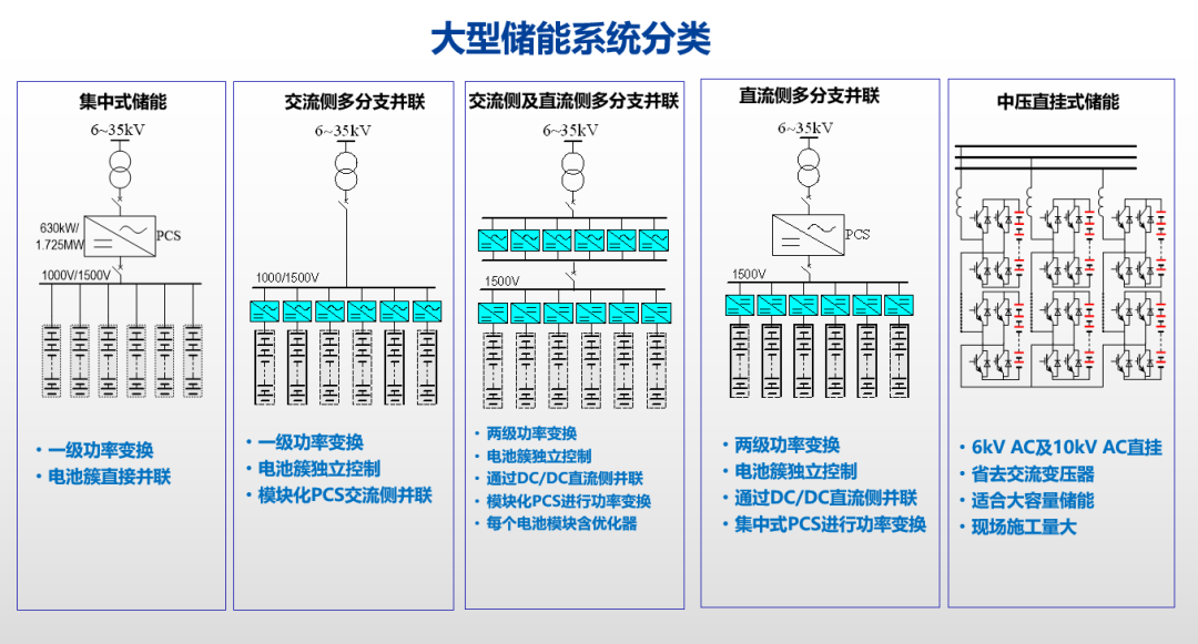 随着储能电站规模的增大,问题也随之而来——100/200MWh的储能电站,需要非常多的电池进行串并联,不断升压、增大电流,提升功率,这就对电路设计以及交流侧、直流侧的拓扑结构优化提出了需求,也由此诞生了6种解决方案: