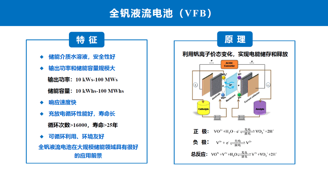 我个人比较看好的是液流电池,我们大连化物所也主要是聚焦在这个领域。液流电池有很多体系,其中技术成熟度最高的是全钒液流电池,利用钒离子的价态变化,实现电能化学能之间的相互转换。
