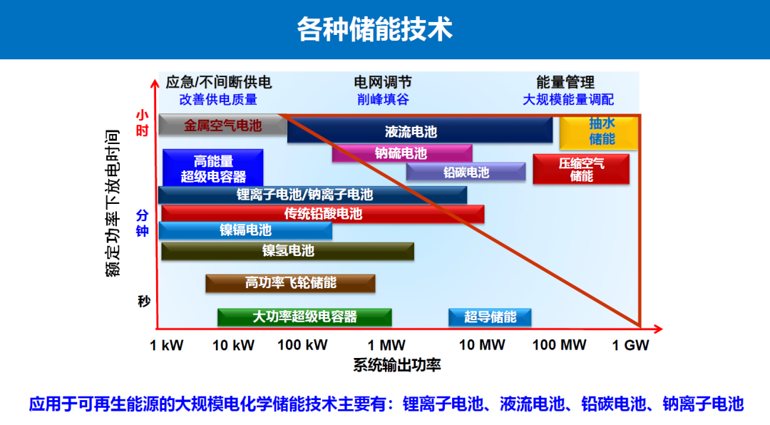抽水蓄能不必多说,目前占比在90%以上,是绝对主力;液流电池、压缩空气、锂离子/钠离子电池、铅碳电池也很适合规模储能。钠硫电池本来也很合适大规模储能,但这些年由于安全问题,已不太受关注。