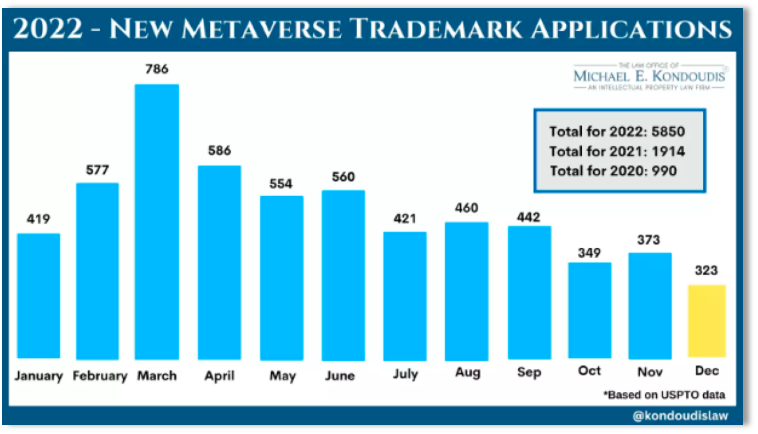 哪怕是在NFT、AI、VR/AR发展成熟的美国市场,元宇宙的热度也在迅速散去:Michael Kondoudis 律师事务所统计的数据显示,2021年,美国专利商标局共收到1914份关于元宇宙相关的商标申请;2022年出现激增,有5850 份,在3月达到注册高峰,随后呈现明显的下降趋势。