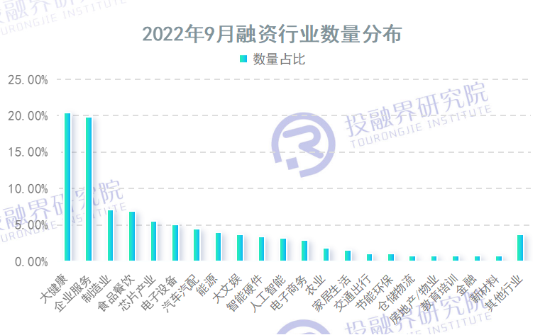 从公开披露融资案例的行业分布来看,9月份,大健康、企业服务在众行业中名列前茅,成功融资案例数量分别以77、75起,稳居行业数量榜单前两名,遥遥领先第三名制造业的27起。