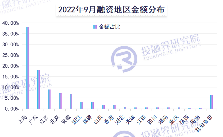 融资金额方面,前五地区的融资总额依然超全国融资总额的七成,但各地区的融资额较融资总数呈现出更大的差异。9月,上海融资总额超257.84亿元,占全国融资总额的38.09%,独领风骚;广东以121.84亿元排在第二,融资额是上海的一半;江苏以61.05亿元,仍居第三。