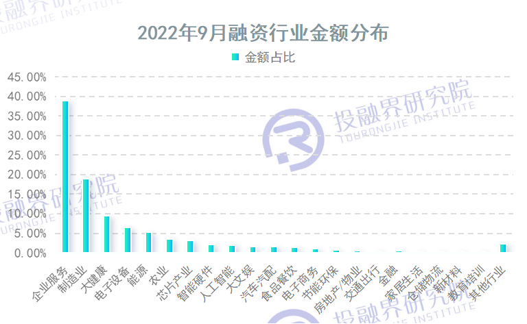 大健康是近两年创投机构竞相追逐的热门行业,9月却出了点小意外,融资案例数量虽然最多,但融资总额仅以63.98亿元,排在行业金额榜单第三名。企业服务和制造业顺势荣登冠、亚军,尤其是企业服务,以一己之力占全行业融资总额的38.84%。