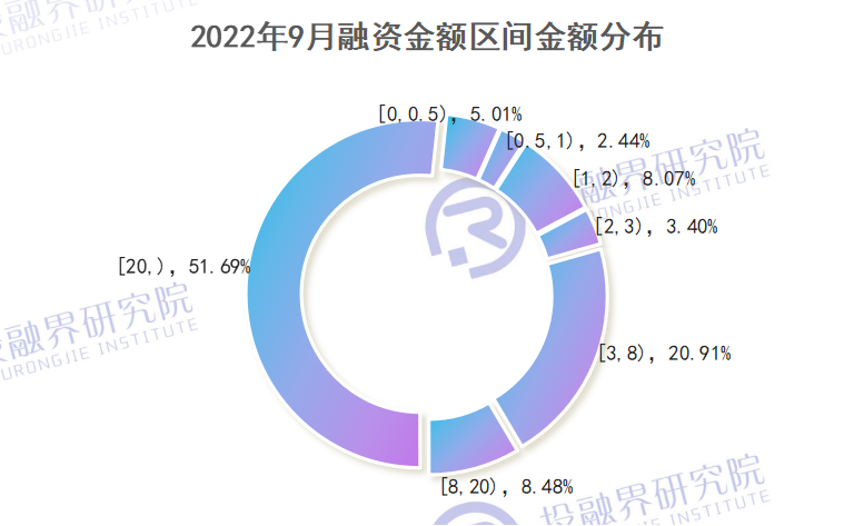 融资金额在1亿元至2亿元之间的融资案例数量有52起,排在融资金额区间数量榜单第二名。之后是融资金额在3亿元至8亿元之间的融资案例,有40起。9月,融资案例数量最少的并不是融资金额在20亿元以上的企业,而是融资金额在8亿元至20亿元之间的企业,仅5起。