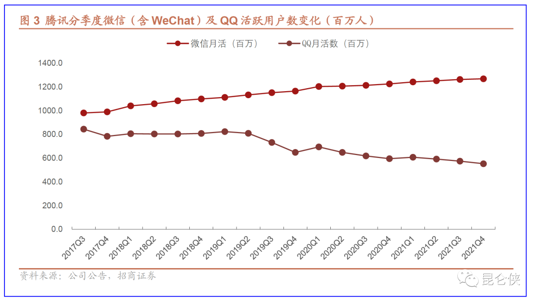 中国互联网人口红利见顶,2022年Q1微信用户数12.88亿,国内渗透率即将见顶。