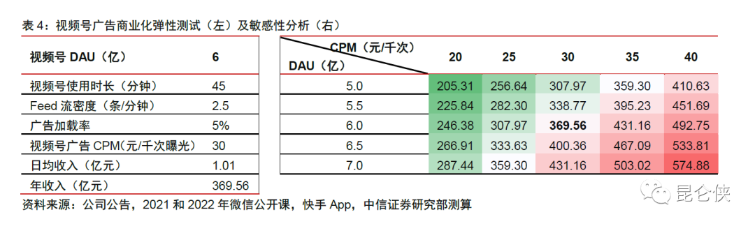 备注:1、假设视频号的MAU为5.5亿;2、付费率和月均ARPPU:考虑到处于变现初期,假设付费率为3%,月均ARPPU为30元。