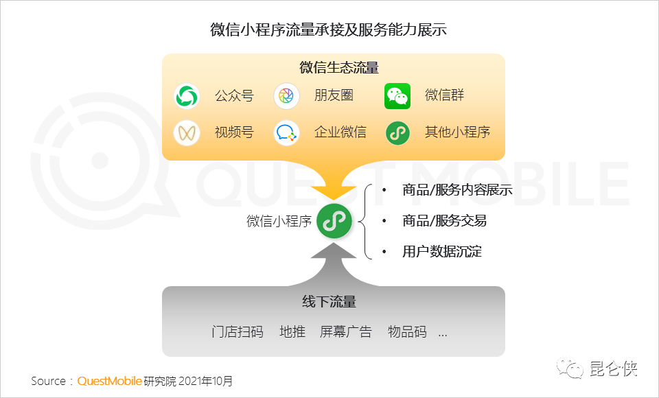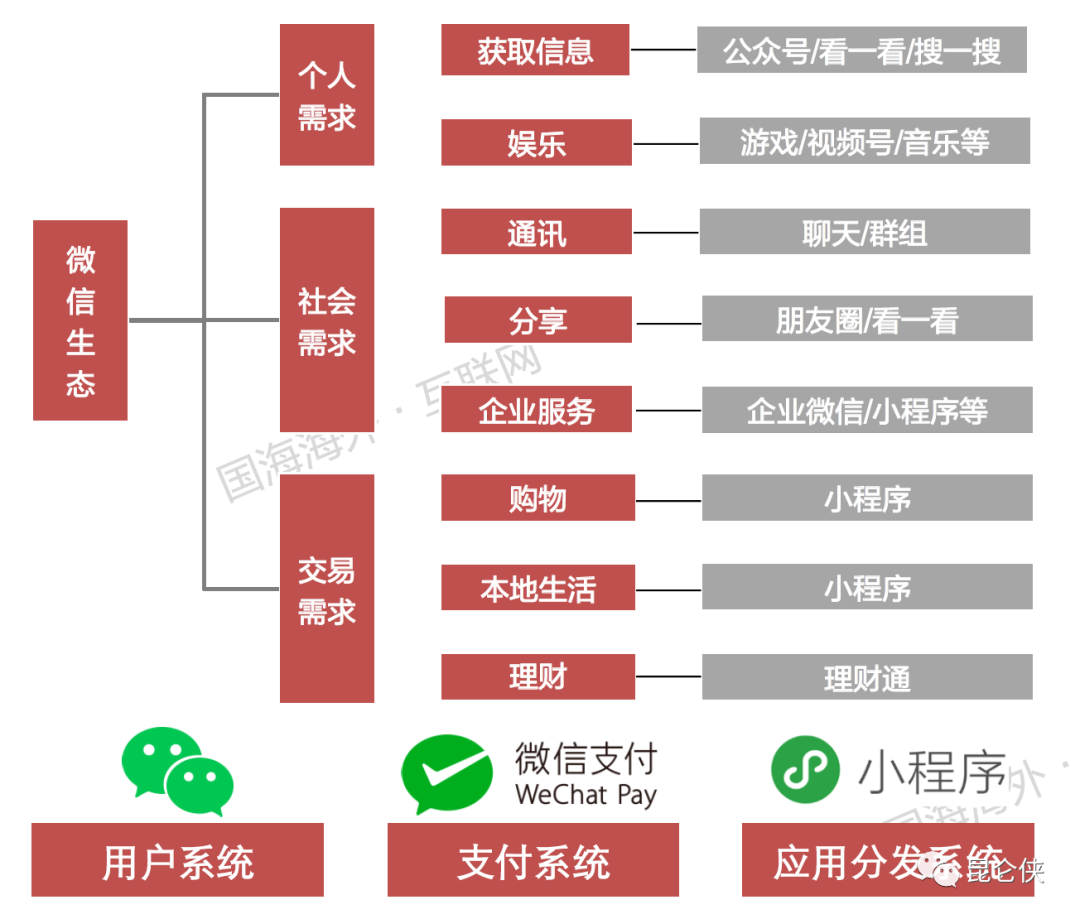 QQ和微信为腾讯带来了巨大的低成本流量和人际关系网络,为此腾讯可以为这些用户提供一站式的数字化服务(即信息、通信、娱乐、商务等),而腾讯在3Q大战后决定实施生态开放战略,已明确核心业务自己做,其余业务交由其它合作伙伴做。