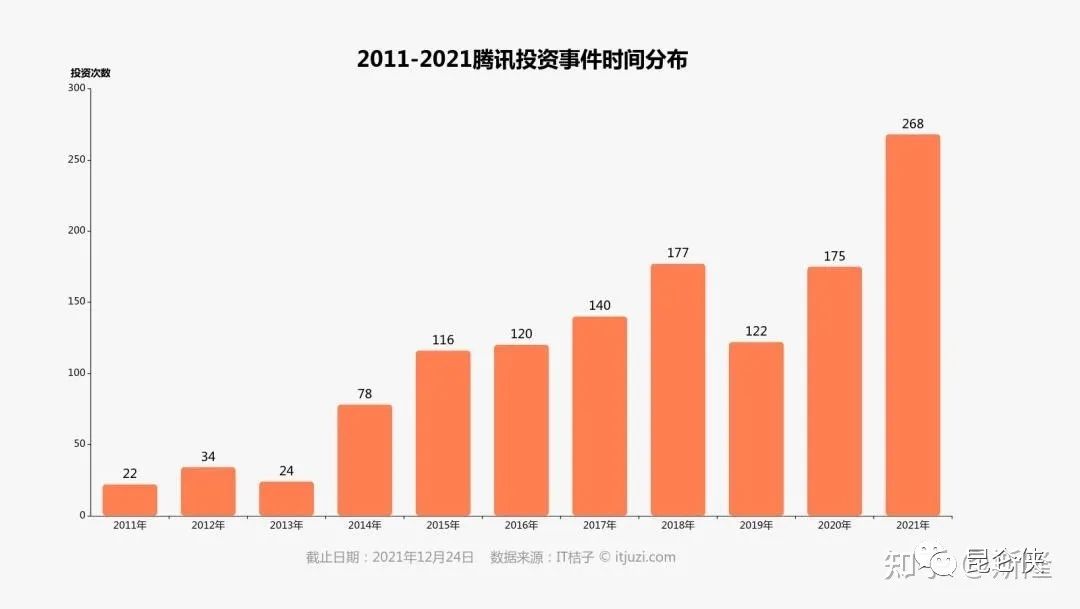 而2021 年,腾讯投资事件达到了创历史纪录的 268 起,对比 10 年前的 22 起,足足翻了 10 倍。平均每 1.3 天就投资一家公司,高峰时一天连投 5 家公司。其投资业绩国内无出其右,直逼美国伯克希尔•哈撒韦公司和日本软银公司。