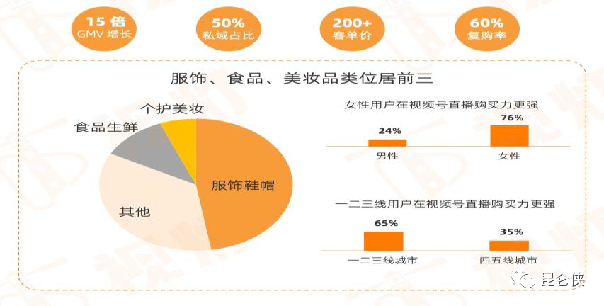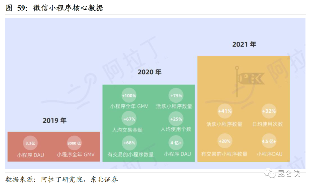 根据2022 年微信公开课数据,2021 年视频号直播带货GMV 较年初增长超15 倍,其中私域占比超过50%,平均客单价超200 元,整体复购率达60%。根据视灯研究院数据,2021 年小程序GMV 规模已达2.8 万亿元水平;