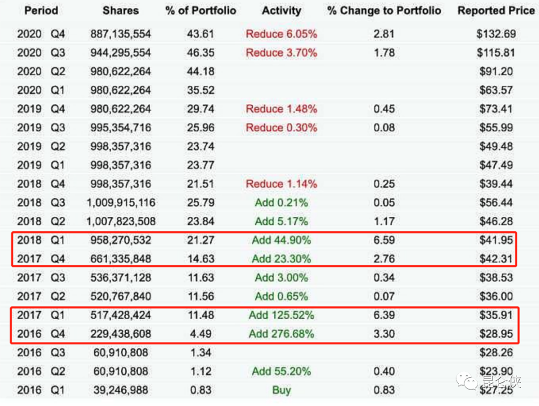 根据公开资料显示,巴菲特从2016年一季度开始少量买入苹果的观察仓后,不断加码苹果,跌了补仓,涨了也加仓,一直买到2018年第三季度才停止,两年多时间苹果公司的仓位从不足1%,逐渐上升到了2018年三季度的25%。当时谁也没想到这个号称“不懂且不碰科技股”的老头子会将一家科技公司买成第一重仓。