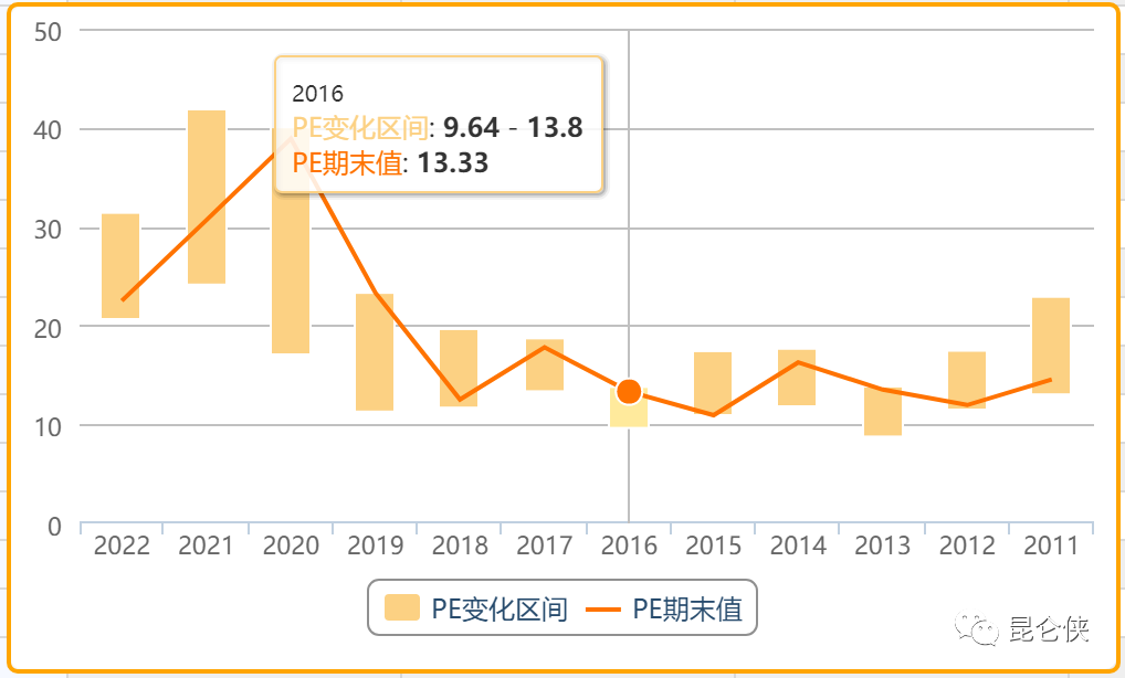 那么巴菲特2016年-2018年买入苹果股票时,市盈率是多少呢?下图是苹果近十年PE变化图,图中可以看到2016年巴菲特刚开始买入时PE在9.64-13.8之间变化,无论是绝对值还是相对百分位而言,确实是历史低位。2018年最后买入苹果时PE没有超过20倍。