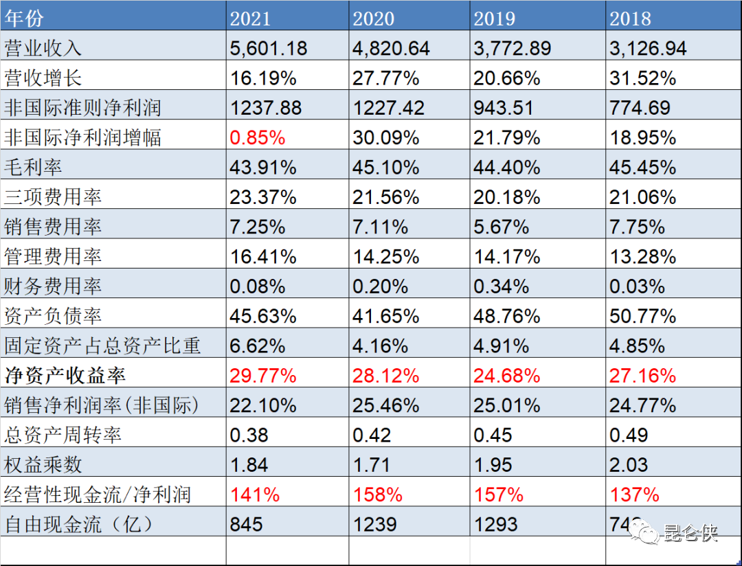 1、近4年来营业收入基本保持在20%+的增长水平,且呈逐年下降趋势。扣非净利润增速略高于营收增速,2021年有点例外。结合其优秀的自由现金流状态,体现了一个产业龙头和接近成熟期公司的特征。