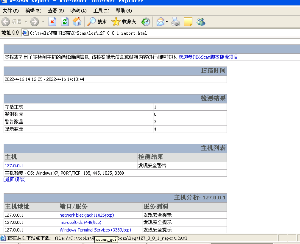 扫描参数设置完毕后,就可以进行扫描了,点击开始按钮或点击【文件】->【开始扫描】进行扫描。开始扫描时,X-scan都会先加载漏洞脚本,然后开始扫描。此处以本机ip为例.