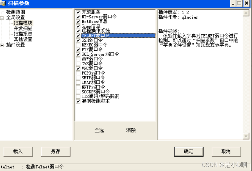 扫描模块:选择本次扫描需要加载的插件。如果想知道某一插件的具体信息可以选择该插件,在右边会显示对该插件的详细描述,包括版本、作者和描述。可根据需要选择相应的插件**。 **