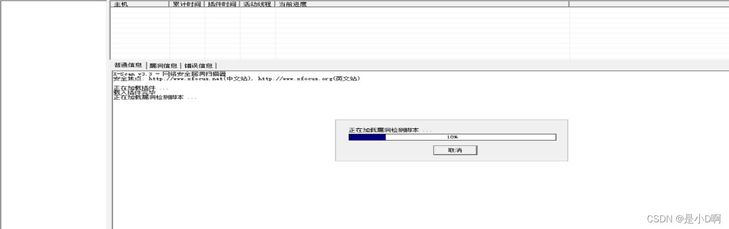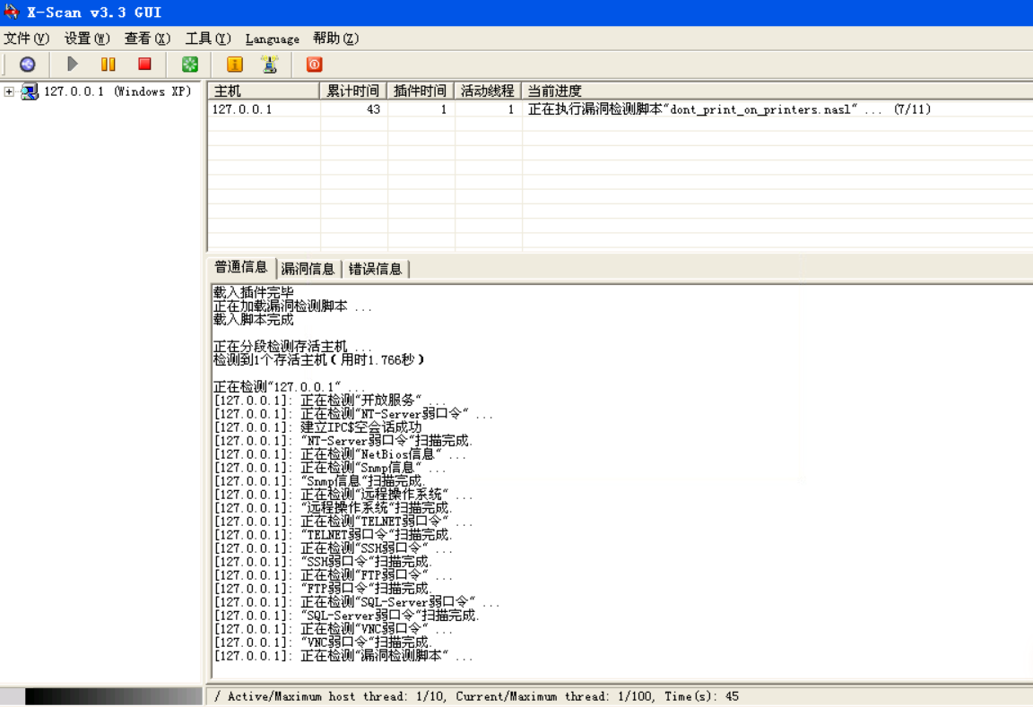 在X-scan的主界面上有三个选项卡,分别是:普通信息、漏洞信息、错误信息。