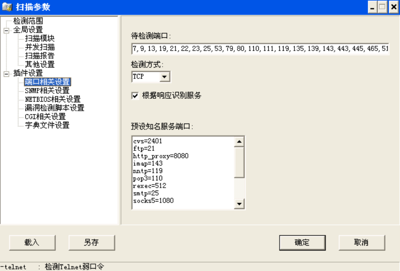 根据响应识别服务:选中后会根据扫描的端口结果返回相应的服务名,具体的对照在下面“预设知名服务端口”中,可自己添加或删除。