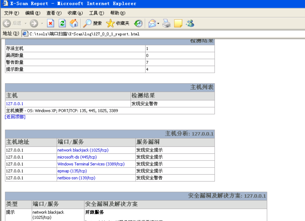 掌握使用X-scan对目标主机进行综合检测,查看相关漏洞信息。