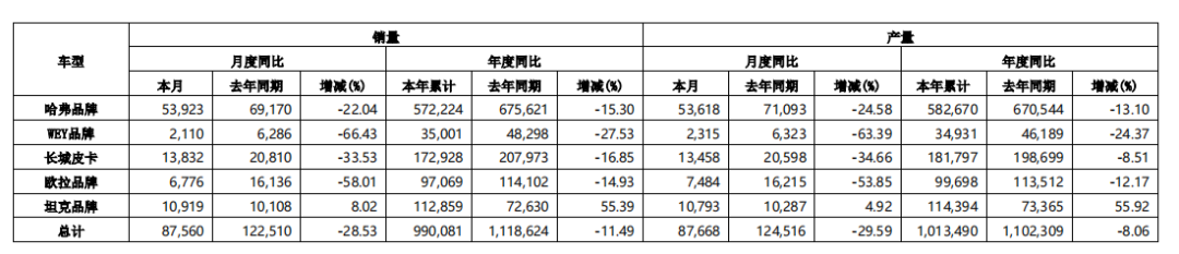 从销量上来看,今年11月,长城汽车销量87,560辆,同比下降28.53%,前11月累计销量990,081辆,同比下降11.49%。