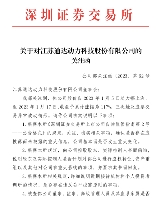 通达动力的火热行情也受到交易所关注。1月17日晚,深交所向通达动力下发关注函,要求公司说明公司基本面是否发生变化,股东及实际控制人是否计划对公司进行股权转让、资产重组以及其他对公司有重大影响的事项。核查公司董事、监事、高级管理人员及其直系亲属是否存在买卖公司股票的行为,是否存在涉嫌内幕交易的情形。
