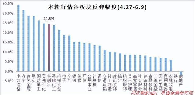 4月27日-6月9日,申万一级行业涨幅前五名分别为电力设备、汽车、有色金属、煤炭和国防军工,主要是成长和资源板块(全球通胀逻辑)。科创50指数涨幅24.5%,放在其中可排第七位。