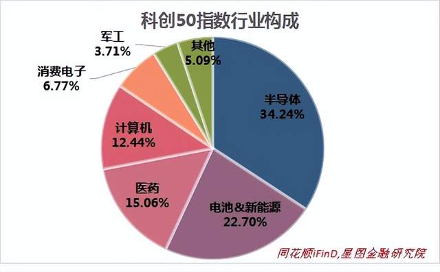从行业构成上看,截至2022年6月9日,科创50前四大行业分别为半导体、电池&新能源、医药和计算机,合计权重84.4%,均属于具有硬科技属性的高成长行业。