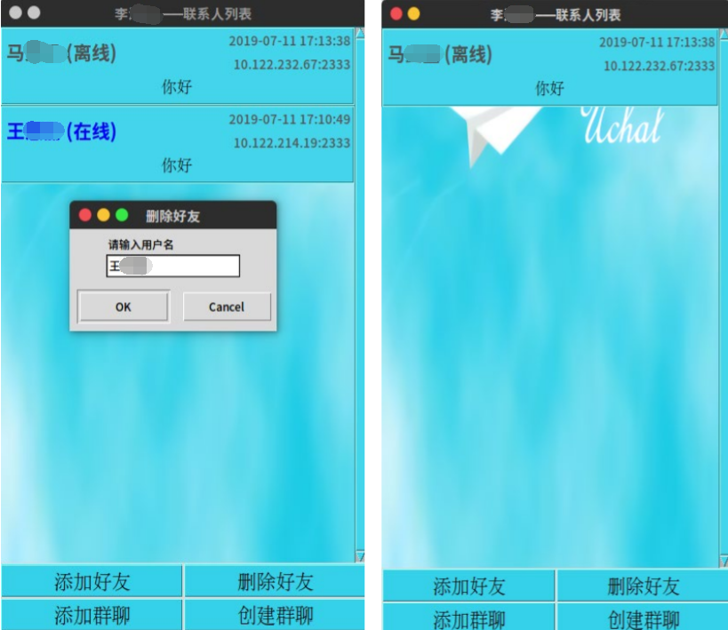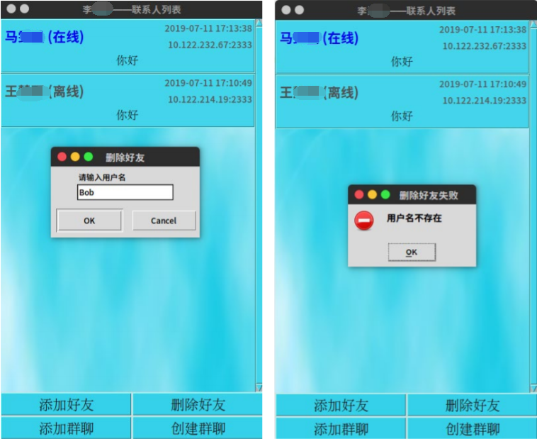 3. 输入正确用户名并点击 OK 后,会显示成功删除好友,并且好友列表进行刷新删除 刚刚删除的好友信息,删除用户也会对好友列表进行刷新,即双方向删除。