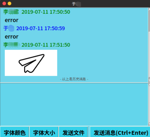 - 群聊界面1. 在群聊界面中,用户可以直接发送消息,也可以点击发送文件按钮发送文件,聊天 框会显示用户名、发送时间和消息内容,不同用户名颜色不同,历史消息会进行缓 存,用户再次打开聊天框时会直接显示。