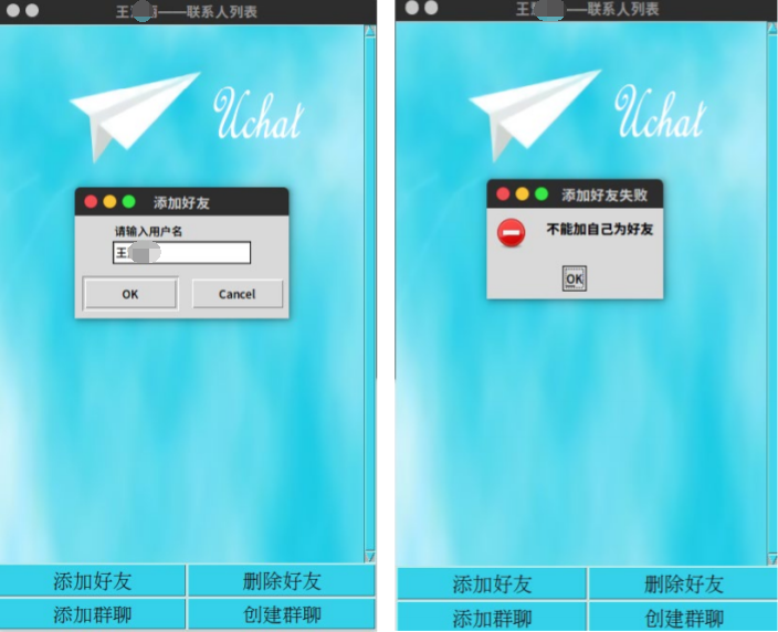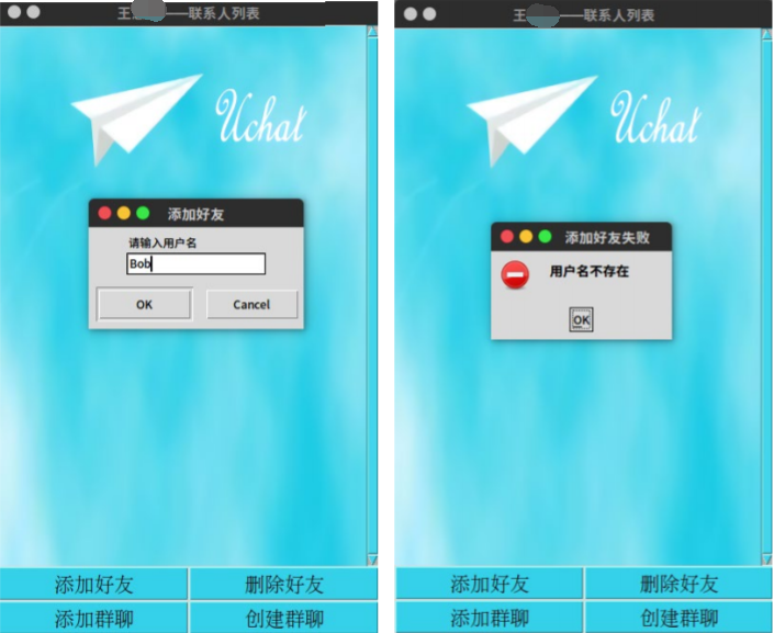 2. 要添加的好友用户名必须为已经注册的用户,否则会显示用户名不存在。