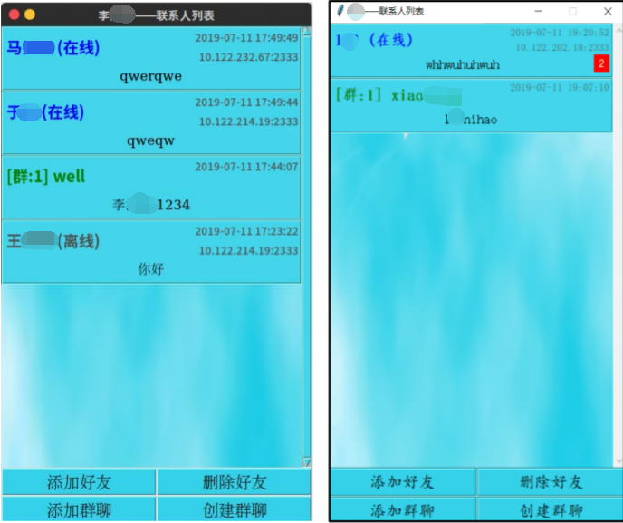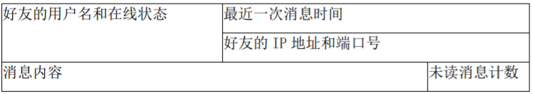 - 好友列表好友列表会显示所有好友的在线状态、IP 地址、端口号、最新消息和未读消息, 好友列表根据用户离线、在线情况对列表进行刷新,将在线和最近聊天用户置顶。