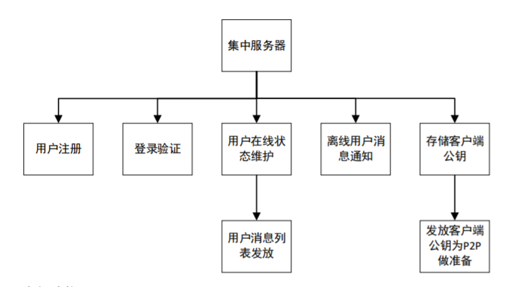 - 集中服务器1. 用户注册:与用户通信完成注册,对用户名和邮箱格式、是否重复,输入不规范等做必要的检验,接收客户端的数字证书,发送服务端数字证书。2. 登录验证:用户登录时,验证用户名和密码是否正确,并向客户端返回登录结果。如信息正确,就将在线好友用户发给该用户,将该用户的状态发给各在线好友用户,同时在服务器端显示出来。3. 用户公钥,证书提供:用户向好友发送消息时,与服务器建立安全连接获取好友的证书信息,服务器控制 client.socket 像好友用户发送信息,实现用户之间的通信。4. 用户在线状态维护:当用户在线时,记录保存用户的在线状态、IP 地址、端口号。5. 用户消息列表实时发放:由监听函数将操作实时加入到执行函数列表中递归执行。向用户发送其好友列表的在线离线情况,包括好友用户名、IP 地址、端口号。并按照最后发消息的时间对好友消息列表进行排序。功能结构图