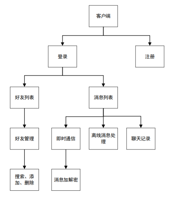 - 聊天客户端1. 注册:用户与集中服务器通信完成注册,包括用户名、密码、邮箱、性别、年龄、数字证书等信息传输,其中数字证书包含公钥、用户名、邮箱等信息。私钥单独保存在客户端一个文件夹下不进行传输;能显示用户名、邮箱不符合格式规范或者重复,空输入等错误信息。2. 认证登录:客户端与集中服务器通信完成用户名、口令认证登录;能显示用户名、密码错误导致的登录错误信息。还有已登录账号再次登录时的多重登录检验,并将之前登陆的账号顶下去。3. 好友管理:用户可通过服务器进行搜索、添加、删除好友。4. 即时通信:用户通过客户端实现与好友的聊天,包括文字、图片传输。文字可实现字体颜色和大小的改变。5. 聊天记录:客户端能够保存聊天记录并且可以查看聊天记录。6. 消息加解密:采用 D-H 体制协商加密秘钥,用对称密码 AES 算法进行加解密。7. 消息摘要:使用 MD5 算法实现消息摘要认证功能,确保发送消息的完整性。8. 用户未读消息提醒:红点标注未读消息数目,并按最后发送消息时间排列好友列表。9. 用户离线后消息处理:用户上线后及时接收到离线时好友发送的消息。功能结构图
