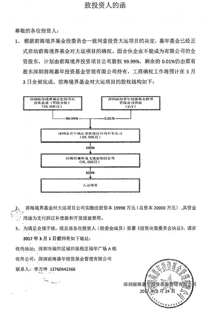前述财务调查报告显示,2017年3月2日、4月12日,前海境界基金分别将投资款1.85亿元、1498万元由基金账户转至嘉年咨询。2017年3月3日,4月19日,嘉年咨询将1.85亿元、1500万元转至大运项目的实施主体龙飞实业。