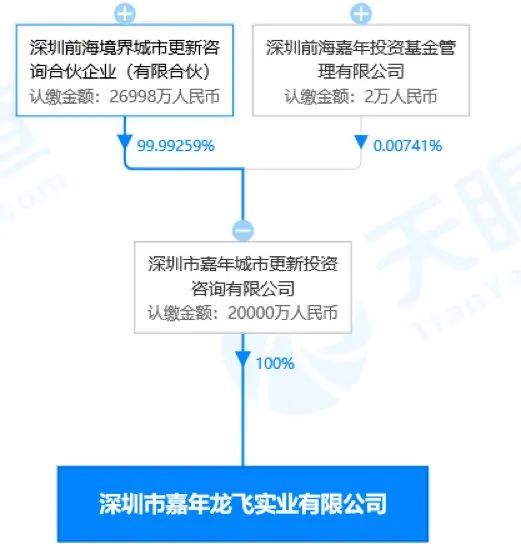 2017年,刘朝阳任执行董事、总经理及法人代表的深圳市前海明石咨询管理有限公司(下称深圳明石),投资了一只私募股权基金——深圳前海境界城市更新咨询合伙企业(有限合伙)(下称前海境界基金)。中基协的备案信息显示,该基金的管理人是深圳前海嘉年投资基金管理有限公司(下称嘉年投资),嘉年投资则是花样年集团100%出资的子公司。