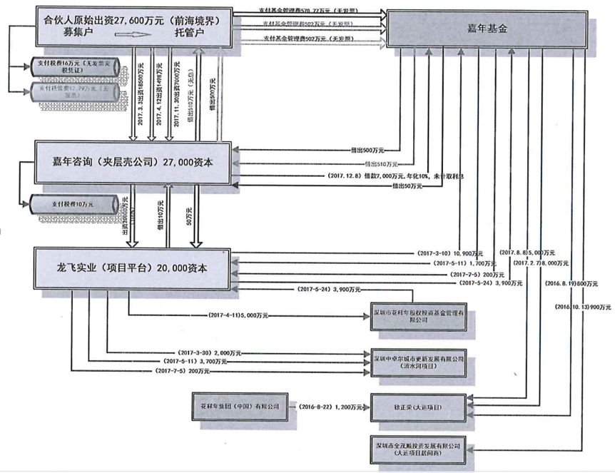 但再往下,龙飞实业对大运项目的具体投资过程就变得非常复杂。为了锁定地块,早在2016年嘉年投资、花样年集团就已经向徐正荣支付了补偿款。在前海境界基金的资金到位并向龙飞实业注资后,龙飞实业再将款项划给嘉年投资。但这先后两次支付却并不能完全对应。例如,财务调查报告显示,花样年集团在2016年8月向徐正荣支付了1200万元,但并未查明龙飞实业何时向花样年集团对应支付过这1200万元。