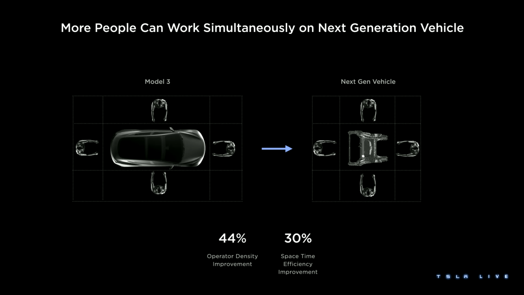 下一代车型上,特斯拉将优化组装工序,提高操作工人的工作密度,减少车间占用面积等。