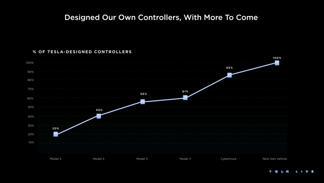 下面这张图,描述了从Model S到Cybertruck的自研控制器占比情况。