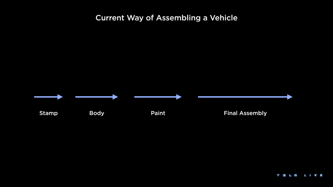 比如,特斯拉将车身分解为几个部分,最终进行一次性组装。