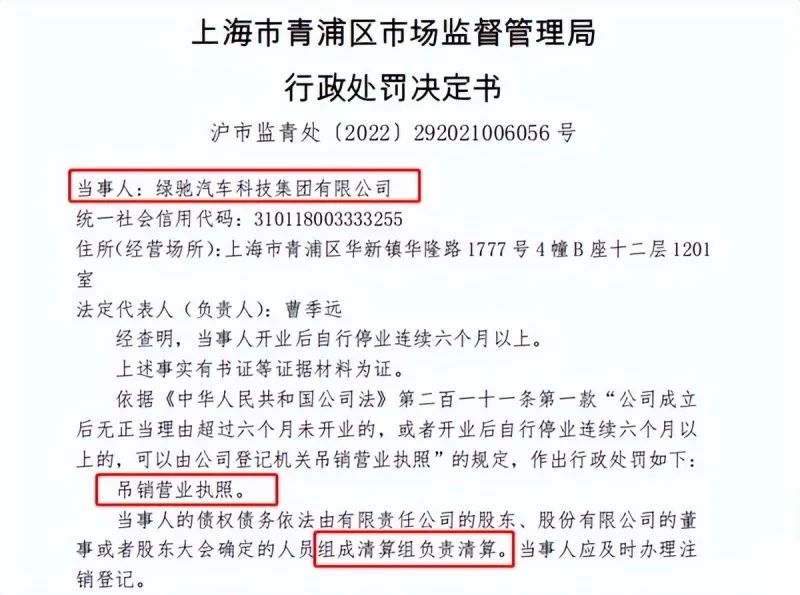 5月17日,上海市青浦区市场监督管理局发布公告称绿驰汽车被吊销营业执照,原因是公司成立后无正当理由超过六个月未开业或者开业后自行停业连续六个月以上。