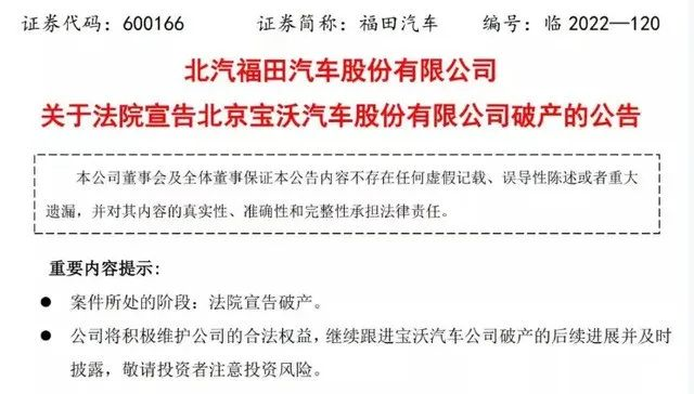 2022年11月29日,北汽福田汽车股份有限公司发布了一则关于法院宣告北京宝沃汽车股份有限公司破产的公告,正式宣告宝沃汽车破产。