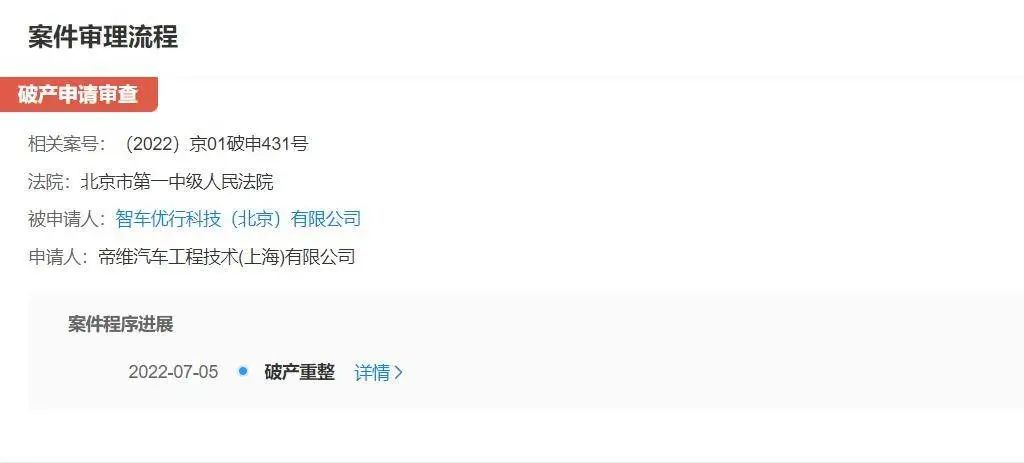 7月12日,帝维汽车工程技术(上海)有限公司向法院申请,对智车优行科技(北京)有限公司强制破产重整。该案件由北京市第一中级人民法院受理,并于7月5日公开。