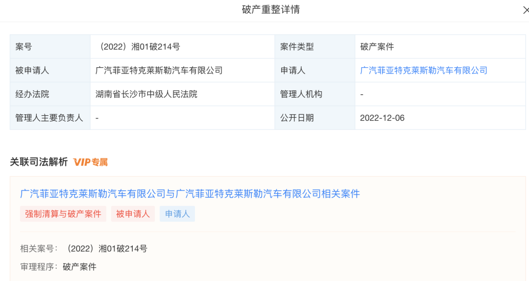 今年7月18日,Stellantis集团和广汽集团先后在官网发布声明,称双方正在协商有序终止合资公司。10月31日,广汽菲克在亏损的状态下宣布申请破产清算。