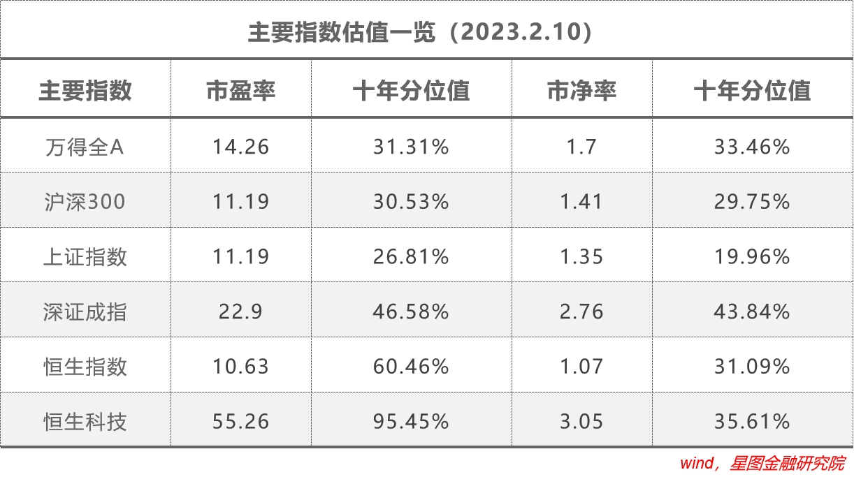 从主要指数的估值来看,现阶段市场已经走出绝对低估领域。以万得全A为例,截至2023年2月10日市盈率十年分位值为31.31%,市净率分位值为33.46%,虽然低于估值中枢,但已算不得绝对低估。