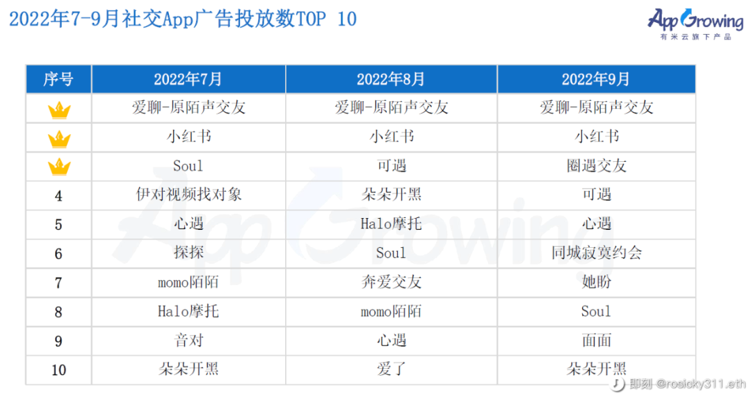 据有米云旗下AppGrowing对社交App广告投放数最新统计:今年三季度的广告投放数中,Soul每月都排在前10。在7月,一度位居前三,仅次于小红书和爱聊App。社交App头把交椅的陌陌、探探,也比不过Soul的投放多。