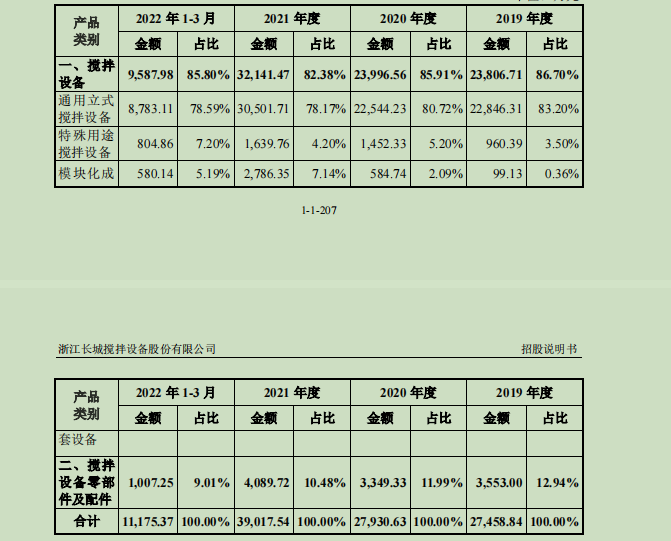 招股书显示,长城搅拌是一家专业从事搅拌设备研发、生产、销售和服务的高新技术企业。数据显示,2019年、2020年、2021年、2022年1-3月,长城搅拌实现营业收入分别为28291.72万元、28716.4万元、40106.35万元、11429.63万元;同期实现归属于母公司所有者的净利润分别为5965.54万元、6694.57万元、7632.36万元、2221.12万元。长城搅拌主营业务收入主要由搅拌设备的收入构成。2019年度、2020年度、2021年度及2022年1-3月,公司搅拌设备的销售收入在主营业务收入中的占比分别为86.7%、85.91%、82.38%及85.8%。