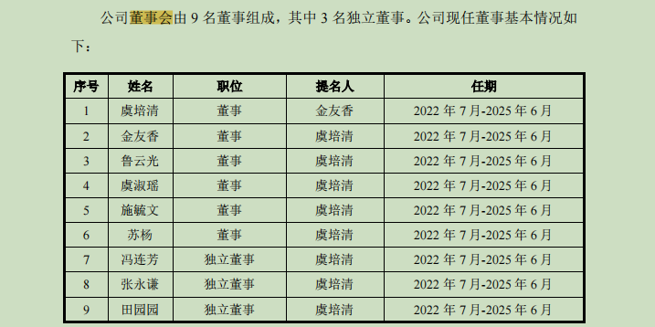 长城搅拌虽然形式上具备法人治理架构,但董事会更像是自己人开会。6名非独立董事中,实控人占了4个席位。虞培清、金友香、鲁云光、虞淑瑶均为董事会成员,虞培清、金友香互相提名,另两名董事施毓文、苏杨则由虞培清提名产生。