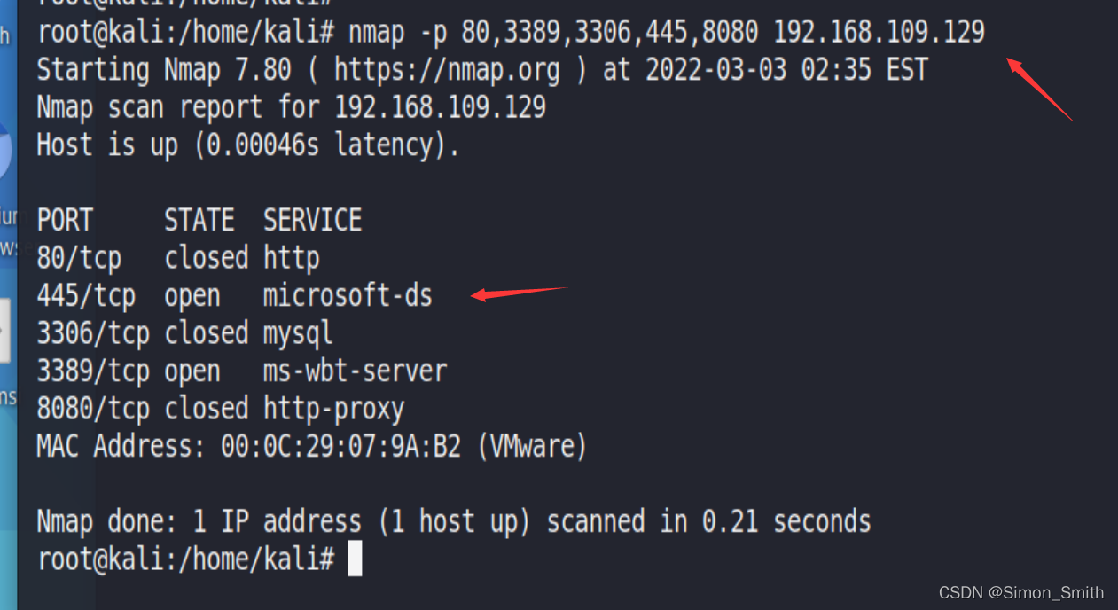nmap -p 80,3389,3306,445,8080 192.168.109.129