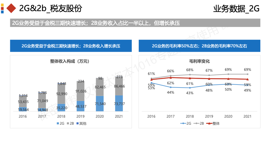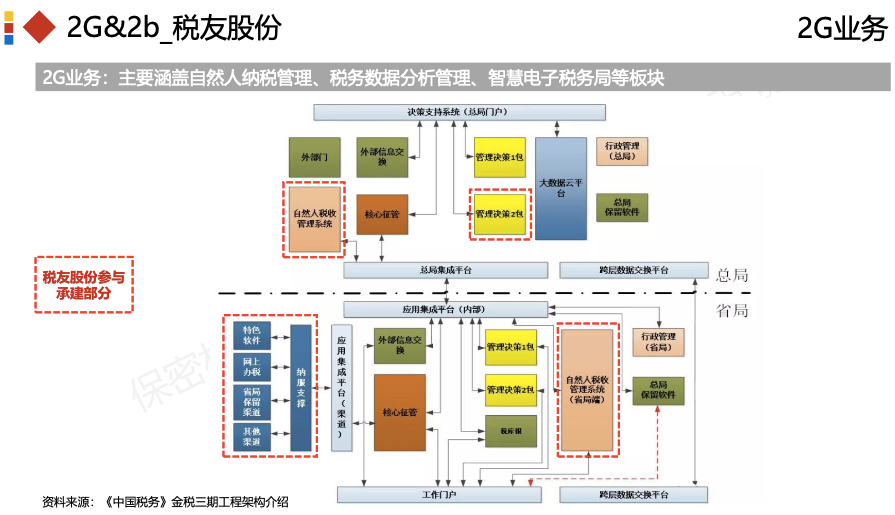以税友集团为例,它当时披露了信息非常完善的招股说明书。税友有一大块2G的业务,是针对国税总局跟各省税务局的业务,同时也会有2B的业务,这两块业务体量差不多。这里还有一个自然纳税管理,前面提到的ITS系统是税友做的,当时的ITS系统整个平台的承建每年都贡献了非常大的金额。