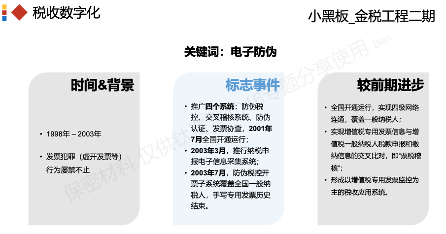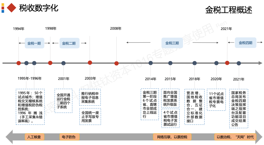 我们把1994年税改至今的整个时间轴进行了划分。金税一期是人工核查,金税二期奠定整个税收体系的电子防伪,金税三期做到了网络互联、以票控税,到现在金税四期叫以数治税。